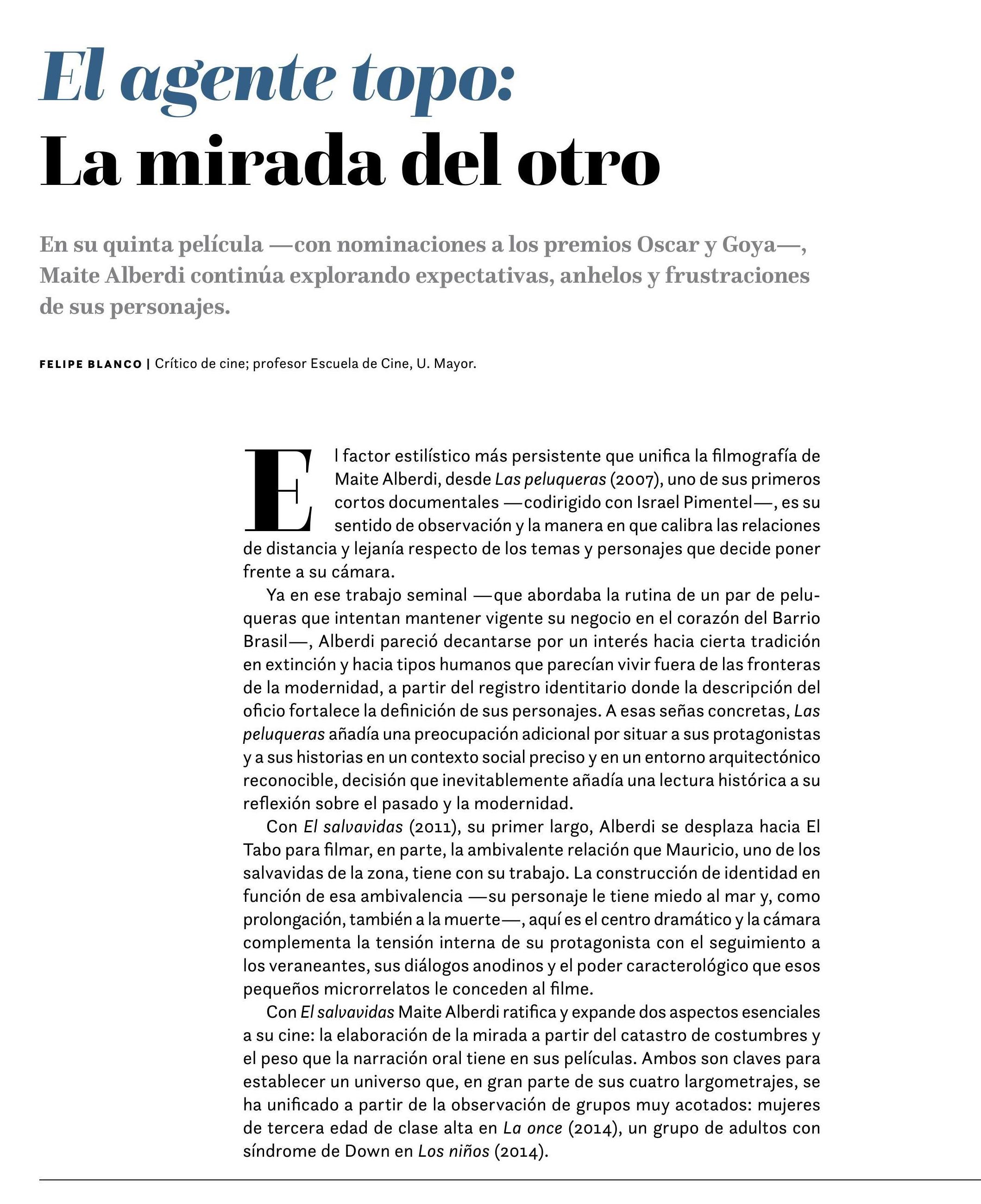 En esta sesión tuvimos el privilegio de ser el primer diálogo abierto entorno al documental el agente topo junto a su directora, maite alberdi y el equipo. Los topos pueden dedicarse, bien a actividades ilegales, como el espionaje o la provocación, o bien a actividades legales. El agente topo, la película chilena dirigida por maite alberdi, obtuvo una histórica nominación a los premios oscar como mejor documental, lo que lo transforma en el primer film chileno que compite en. El agente topo narra la aventura de un octagenario que se infiltra en un asilo de ancianos, a desfilan por esta docuficción personajes entrañables que, fuera de todo guión, tejen una historia. It was screened at the 2020 sundance film festival in the world cinema.