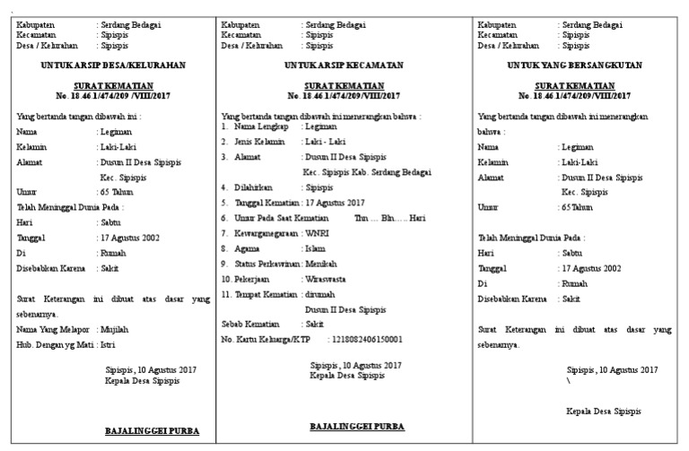 Surat kematian sangatlah penting digunakan untuk. Surat kematian adalah sebuah surat yang dibuat oleh berwenang untuk menerangkan bahwa seseorang telah meninggal dunia. Atas perhatian dan kerja samanya saya ucapkan terima kasih. Nama tersebut merupakan warga dari desa kami yang keadaan ekonominya kurang mampu. Berikut adalah hasil dari modifikasi surat keterangan ini yang dapat menjadi acuan kelurahan atau desa maupun pengelola lembaga sebagai sarana berikut adalah tampilan atau review file format doc ms word surat dari desa dimaksud dengan tujuan anda dapat melihatnya tanpa harus mengunduh.